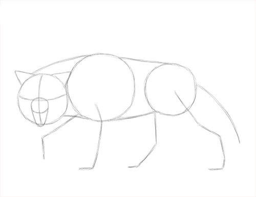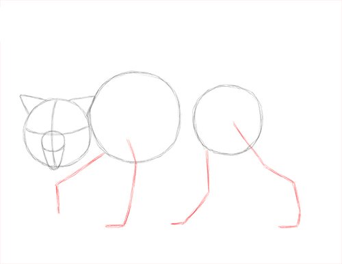 - Выделим переднюю часть мордочки с помощью линий. На их конце нарисуйте круги – это будущие глаза. От глаза, который располагается ближе к нам проведите дополнительный отрезок с шерстью, чтобы получилась щека.