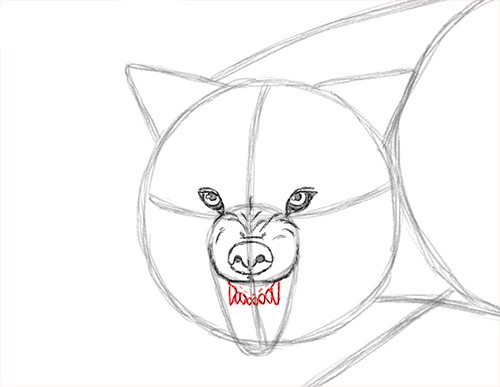 Хищник у нас будет со злобным выражением морды, будто он хочет на кого-то написать. Детализируем голову, небольшие глаза, острые клыки и сморщенный нос для передачи эмоций зверя.