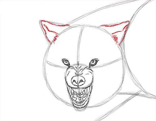 Прорисовываем морду: уши и пасть. Детализировать пока что ничего не нужно, просто рисуем непонятные геометрические фигуры